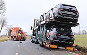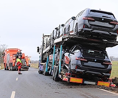 Autotransporter mit Neuwagen in Bankette