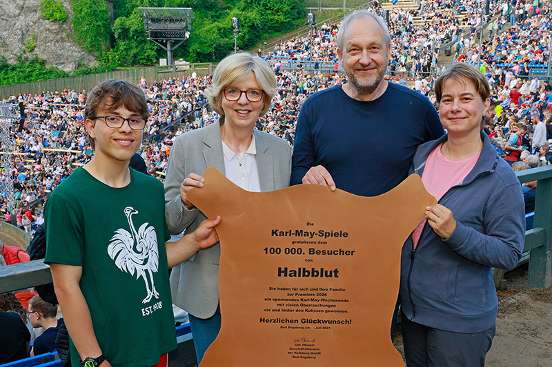 Bad Segeberg (anz) – Das spannende Abenteuer „Halbblut“ kommt bei den Zuschauern bestens an: Bei den Karl-May-Spielen herrscht große Freude, dass die Begeisterung des Publikums für den Wilden Westen am Kalkberg ungebrochen ist. Am Freitagabend wurde der 100.000. Besucher begrüßt: Stefan Treu aus Hamburg. Wie im Vorjahr wurde diese Marke in der 20. Vorstellung übersprungen. Die Karl-May-Spiele schließen somit an die Top-Ergebnisse der Vorjahre an.