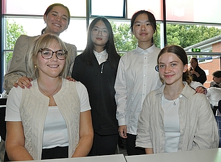 (V.li.) Eylin Sudrow (20) und Zenj Ziyan sowie Xu Ruoxin (beide 16) und Janne Solvej Miller (17) haben sich bereits beim Besuch im April in China kennengelernt und waren bei den jeweiligen Familien untergebracht. Lehrerin Solveig Lütt (vorne li.) unterstützt beim Ablauf des Gegenbesuchs. Fotos: Straehler Pohl
