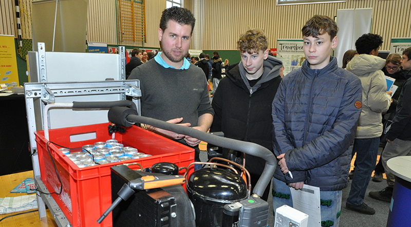 Jan-Markus Ladewig, Geschäftsführer der Firma KKF Klimatechnik in Bad Bramstedt, erklärte Lekado und Leon bei der BIM 2025 die Funktionsweise eines Verflüssigungssatzes zum Kühlen von Flüssigkeit, der in ähnlicher Weise ein Prüfungsthema für die Gesellenprüfung ist. Foto: Straehler-Pohl