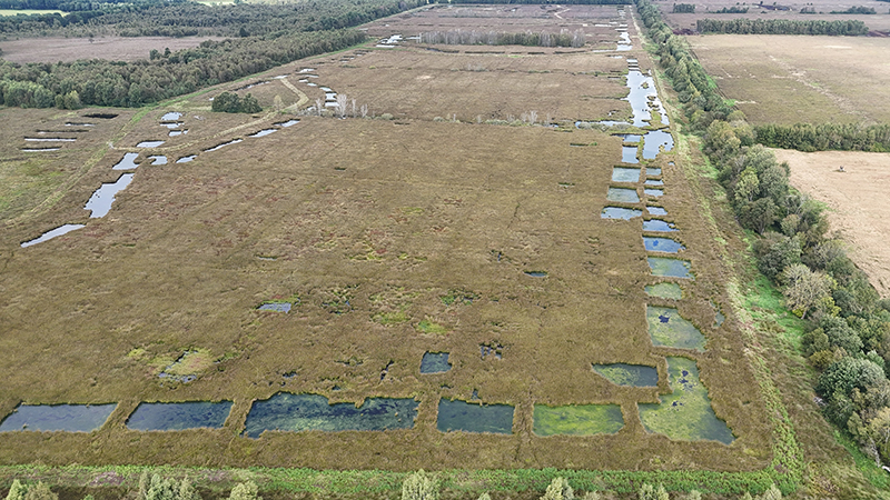 650 Hektar beträgt die Gesamtfläche des Grotmoores, Während ein erster Abschnitt von gut 73 Hektar bereits venässt wurde, befindet sich der zweite Abschnitt von knapp 96 Hektar noch in Arbeit. Dafür sind Spezialbagger im Einsatz, um die Flächen so umzubauen, dass das Wasser künftig im Moor gehalten wird. Dabei werden die Drainagen entfernt, die Gräben zugeschüttet und Wälle gebaut, um das Wasser am Ablaufen zu hindern.