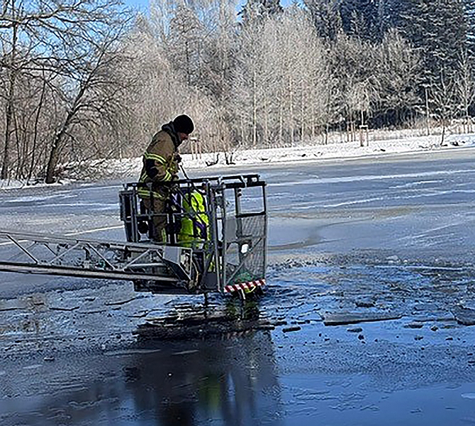 Zum Glück nur eine Übung: Die Rolandfeuerwehr übte im Köhlerhofsee mit verschiedenen Methoden, wie mann eine Person rettet, die im Eis eingebrochen ist. Fotos: Rolandfeuerwehr