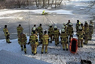 „Als erstes das Zuschmeißen von einem schwimmfähigen Körper, damit die Person sich über Wasser halten kann – in unserem Fall hatten wir ein Rohrdichtkissen, das gut geschmissen werden konnte –, benutzt. Danach ist der Rettungstrupp in Überlebensanzügen mit Hilfe eines Rettungsbretts zur Person vorgegangen, um die Person damit aus dem eiskalten Wasser zu ziehen. Als zweites benutzten wir eine Schleifkorbtrage (Standartbeladung der Drehleiter). Da kann sich die eingestürzte Person reinlegen und wir können sie dann mit der Trage ans Ufer ziehen. Als letzte Möglichkeit wurde die Rettung über den Drehleiterkorb geübt. Die Möglichkeit ist nur bis zu einer Entfernung von maximal 15 Metern vom Ufer möglich – je nach Aufstellmöglichkeit der Drehleiter“, erklärt der Wehrführer.