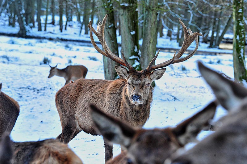 Auf dem Winterspaziergang gibt es viel Spannendes zu entdecken: Die quirligen Fischotter, die auch bei eisigen Temperaturen im Wasser spielen, das kapitale Rot-, Dam- und Blesswild, die grunzenden Wildschweine, die beeindruckenden Wölfe und die flinken Füchse in ihrem warmen Winterpelz. Die Hirsche können von den Besuchern mit Wildfutter gefüttert werden. Mitgebrachte Äpfel als Spende und Leckerbissen für die Tiere können gerne im Eingangsbereich abgegeben werden. Während der Führung wird auch die Fütterung der Wölfe um 15.30 Uhr und besucht und bei einer kleinen Pause kann man die wohlige Wärme der großen Feuerschale genießen. Dort werden auch ein heißer Punsch und leckere Brezeln angeboten.