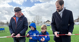 Den symbolischen Startschuss gaben schließlich der Bürgermeister und der Staatssekretär zusammen mit jungen Kickern, als sie das rote Band durchschnitten. Direkt im Anschluss wurde der Platz mit einem Turnier der Nachwuchsmannschaften eingeweiht.