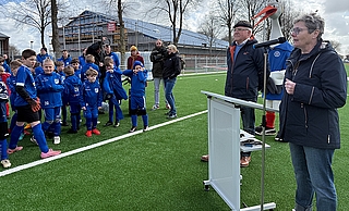 Für einen humorvollen Auftakt sorgte Innenstaatssekretär Frederik Hogrefe. Mit einem Augenzwinkern erklärte er, dass er als Hobbyfußballer selbst gern auf dem neuen Platz spielen würde – derzeit jedoch verletzungsbedingt pausieren müsse. Gleichzeitig unterstrich er die Bedeutung der Anlage: Endlich seien Spiele und Training unabhängig von Wetterkapriolen möglich. Gerade in der Marsch hatten Regen, aufgeweichte Böden oder Unebenheiten den Spielbetrieb immer wieder erschwert.