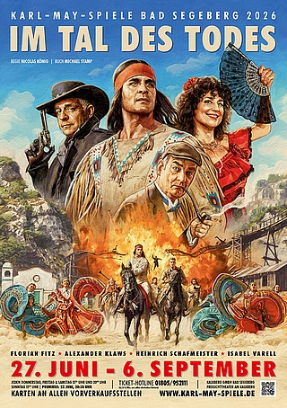 Bad Segeberg (anz) - Mexikanische Señoritas mit wirbelnden Kleidern in einem temperamentvollen Tanz, eine reißende Hängebrücke vor einem gewaltigen Feuerball, eine verwegene Reitergruppe und mittendrin die prominenten Hauptdarsteller des neuen Wildwest-Abenteuers „Im Tal des Todes“ – all das zeigt das neue Plakat der Karl-May-Spiele. Bald schon wird dieses Motiv in ganz Norddeutschland zu finden sein. Mit der Vorstellung des Plakates ist der Startschuss für die Werbekampagne der Karl-May-Spiele 2026 gefallen.