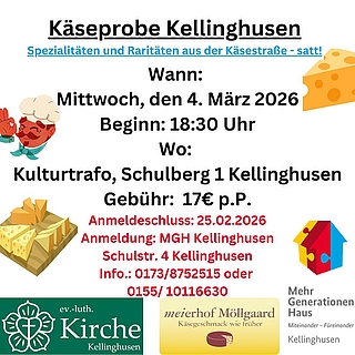 Kellinghusen (bg) – Die Kirchengemeinde Kellinghusen, der Meierhof Möllgaard und das Mehrgenerationenhaus (MGH) laden am Mittwoch, den 4. März, um 18.30 Uhr zur Käseprobe in den Kulturtrafo (Schulberg 1) ein. Es wird Spezialitäten und Raritäten von der Käsestraße geben.