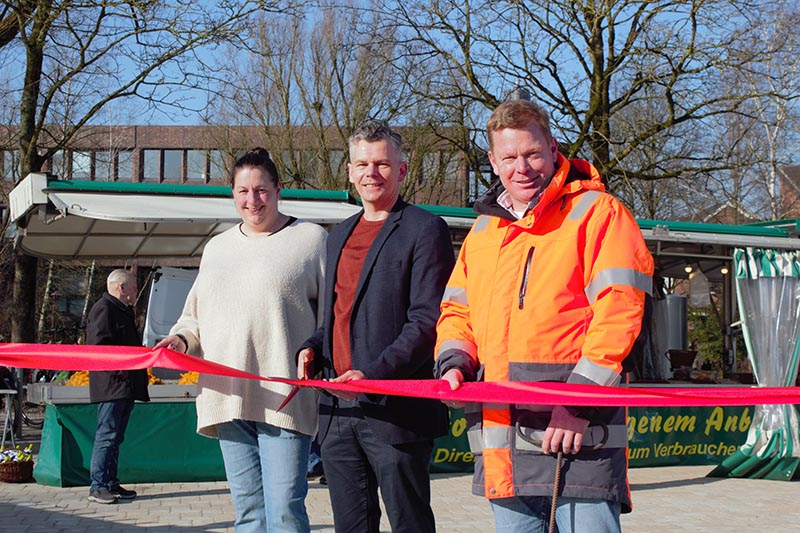 Auch die Marktbeschicker gaben erste Rückmeldungen. Sabine Asmussen freute sich, ihren angestammten Platz wieder beziehen zu können. „Es ist modern und schick und die Beleuchtung macht uns am Morgen das Arbeiten leichter.“ Zwar empfand sie die Zeit auf dem Meierei-Parkplatz als „enger zum Rangieren, aber auch kuscheliger“. Gürkan Sarisoy lobte die große Rangierfläche und die verbesserte Stromversorgung. Antje Schatzram vermisst hingegen die Bäume, die eine besondere Atmosphäre auf dem Meierei-Parkplatz schafften: „Der neue Marktplatz ist weitläufiger, wirkt aber etwas steril.“