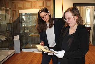 Esther Wrobbel (l.) und Vivian Vierkant zeigen in der Sonderausstellung „Zwischen Macht und Gelehrsamkeit“ auch Originalausgaben einiger Bücher von Heinrich Rantzau. © Görke