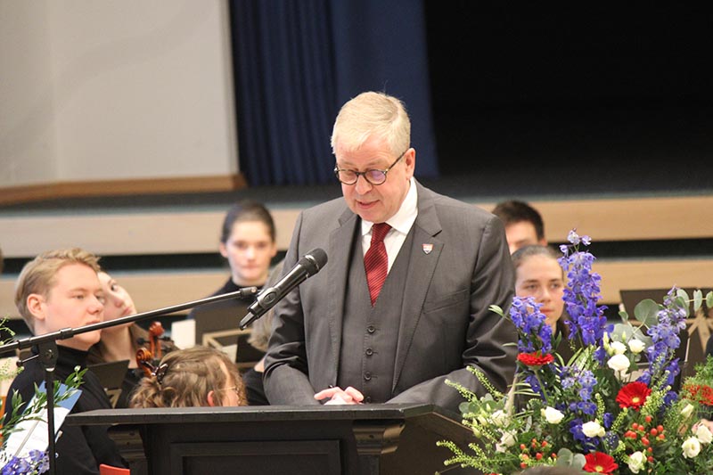 Landrat Claudius Teske stellte die Frage in den Raum: „Ist die Welt in einer Krise oder ist es eine Herausforderung?“ Weltweit sei eine Radikalisierung festzustellen. Aber auch wenn vieles Angst mache, bräuchte es Zuversicht. „Wir brauchen Mut,  um den Herausforderungen zu begegen!“ Er plädierte dafür, sich auf das zu konzentrieren, was vor Ort machbar sei. „Auch im letzten Jahr haben sich einige neue Start-Ups am Innovationszentrum etabliert. Ein Forschungsprojekt für Mikrochips am ISIT wird mit insgesamt 33 Millionen Euro gefördert. Weltweit führende Unternehmen entscheiden sich bewusst für Itzehoe. Im Gegensatz zu anderen Landkreisen erwartet unsere Wirtschaft einen Wachstum und wir haben einen riesigen Schritt in Richtung Hochschullehrgang gemacht. Hier entwickeln sich großartige Dinge. Das sollte uns Mut machen, die Herausforderungen gemeinsam anzugehen!“