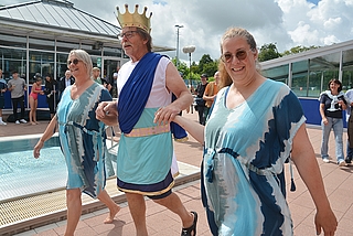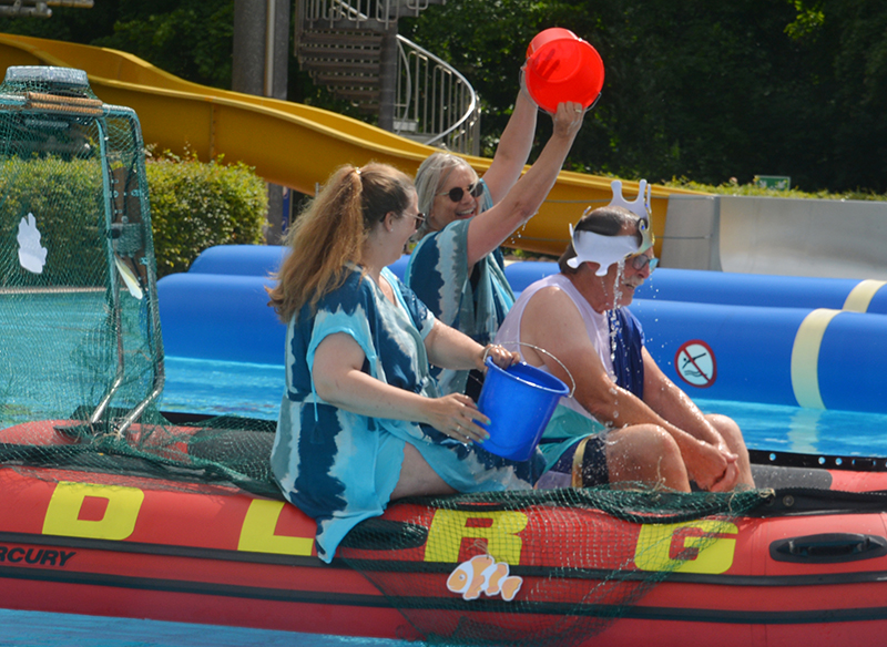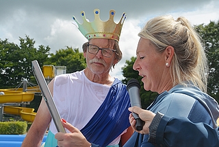 Boot durchs Nichtschwimmerbecken gezogen und getauft. Nun trägt „der Herrscher über alle Becken und Beckenränder, Freiflächen, Sprungtürme und Rutschen“ den Namen „HP Neptun von der Roland Oase“. Beurkundet haben den Taufschein das Team der Roland Oase, die DLRG und alle seine Fans.