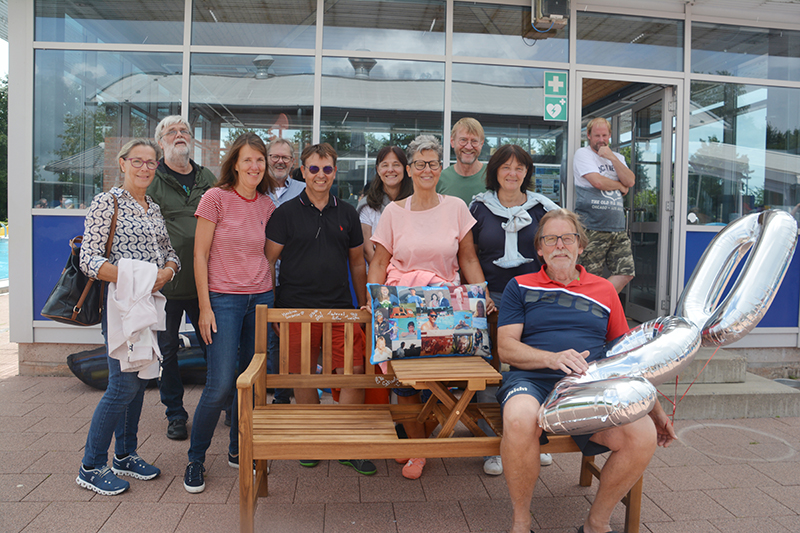 Bürgermeister Felix Carl überbrachte die Glückwünsche der Stadt und würdigte Kalusok mit dem Lied „HP – unser Held im Bad“. Das Team der Stadtwerke/Wirtschaftsbetriebe gratulierte ebenso recht herzlich wie etwa die langjährigen Schwimmfans und der Saunaverein. „Unseren Verein würde es ohne dein persönliches Engagement gar nicht geben“, so Britta Aschinger vom Vorstand des Saunavereins Roland Oase. Im Namen der Schwimmabteilung der Kaltenkirchener Turnerschaft, die in der Roland Oase trainieren, gratulierte der Vorsitzende Fritz Reche. Ihr Geschenk: eine Einladung zum „Seepferdchen-Kurs“.