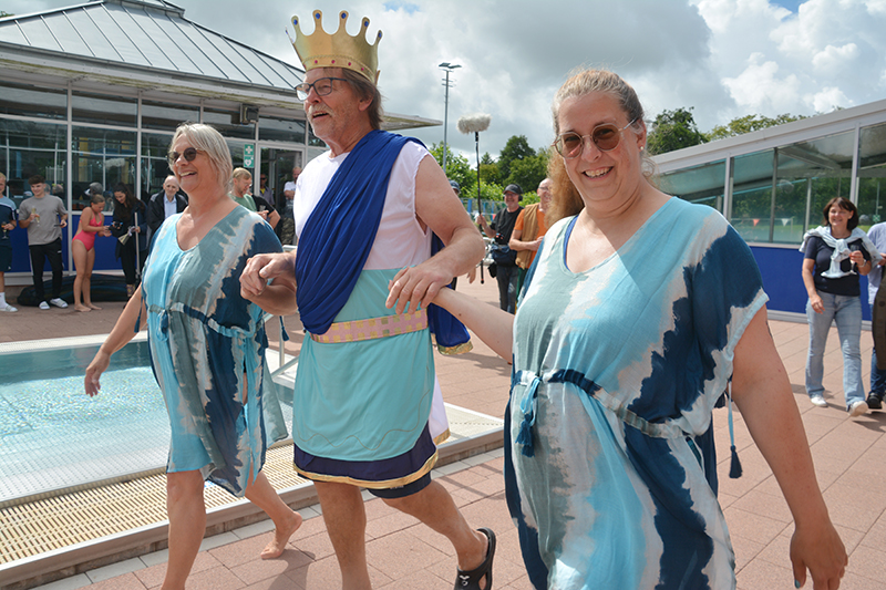 Auch Bernd Hofmann, Pastor im Ruhestand, gehört seit Jahrzehnten zu den Frühschwimmern. In seiner Dienstzeit wohnte er gleich gegenüber der Roland Oase, hat gesehen, wie Kalusoks Kinder im Bobbycar fuhren und aufgewachsen sind. „Ja, die Roland Oase ist ein Familienbetrieb“, blickte er auf Steffi, David, Lena und Jenny – und erntete damit großen Applaus. Die Roland Oase beruhe im Großen und Ganzen auf Kalusoks Vorstellungen, so Hofmann. „Das Bad sieht aus wie neu.“ Übrigens: „Du hast mir das Kraulen beigebracht“, verriet er. Und selbst, wenn die Menschenschlange vor dem Schwimmbad noch so lang ist: „Du bleibst immer ruhig“, sagte er voller Bewunderung.