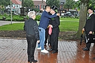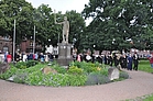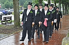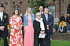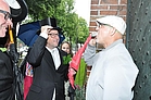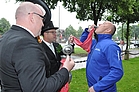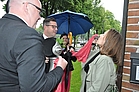 Beim Tanz um den Roland, der immer vor dem Kommers im Kaisersaal stattfindet, hatte der Wettergott zum Glück ein Einsehen mit der Festgesellschaft. Dort konnte sich auch die Gäste aus Polen aktiv einbringen, während Agatha Schuster aus Bad Bramstedt und Daniel Puchalski aus Polen kaum eine Chance hatten, das Geschehen aus dem Plattdeutschen ins Polnische zu übersetzen.