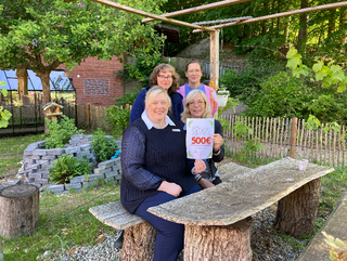 Zur Preisübergabe der "Klimaaffen Störtalcampus" trafen sich Ilka Schack, Schulleiterin des Störtalcampus, Stephanie Neubauer von der Sparkasse Westholstein, Franziska Fehr vom Förderverein Störtalcampus und Sandra Ludwigh, Klimaschutzmanagerin des Kreises Steinburg bei bestem Wetter.