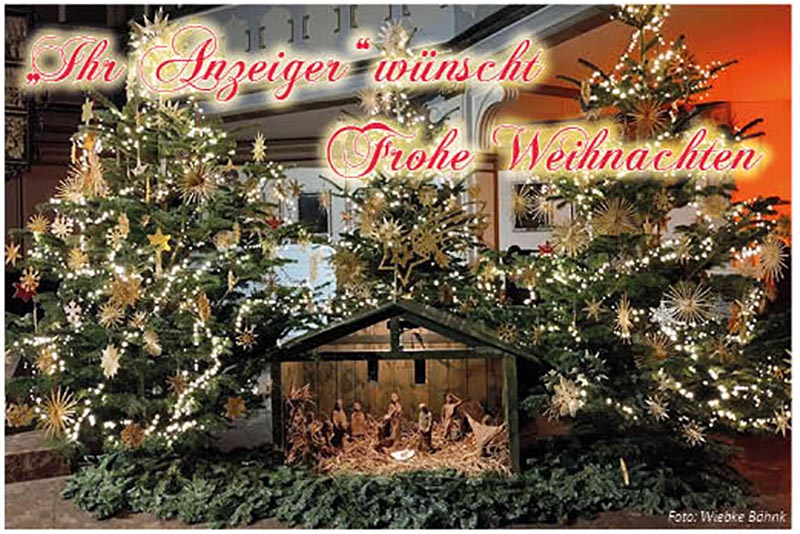 Kreis Steinburg (anz) – Das Weihnachtsfest steht vor der Tür. Auch wenn der Schnee in diesem Jahr ein frommer Wunsch blieb, so luden doch zahlreiche Weihnachtmärkte dazu ein, die Adventszeit zu genießen. Das Team des Anzeigers wünscht allen Lesern, Inserenten, Kunden und Austrägern frohe und friedvolle Weihnachten und besinnliche Tage im Kreise ihrer Liebsten.