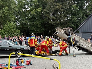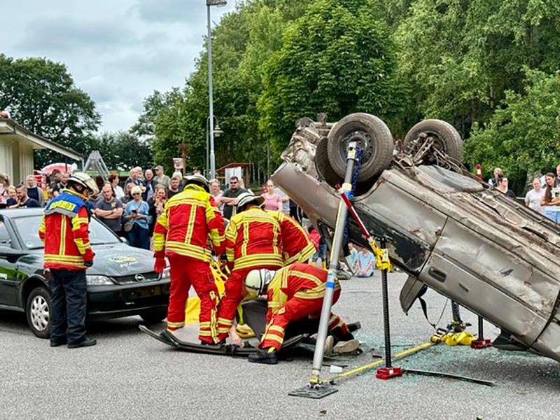 Im Mittelpunkt stand eine groß angelegte Einsatzübung: Ein schwerer Verkehrsunfall wurde realitätsnah simuliert – inklusive der Rettung einer eingeklemmten Person aus einem verunfallten Fahrzeug. Die Freiwillige Feuerwehr Itzehoe führte den Einsatz mit hoher Präzision und moderner Technik durch.
