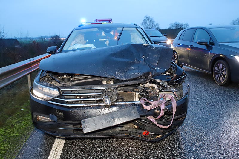 Ein nachfolgender 48-Jähriger aus Hamburg, der einen Mercedes Sprinter führte, bremste sein Fahrzeug rechtzeitig ab. Ein dahinter fahrender 27-jähriger Elmshorner in einem weißen Ford konnte nicht mehr rechtzeitig bremsen und fuhr auf den Sprinter auf. Anschließend kollidierte ein 51-jähriger Fahrer eines schwarzen VW aus dem Kreis Rendsburg-Eckernförde mit dem Ford.