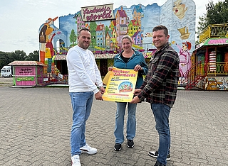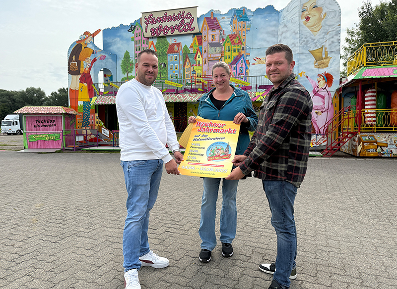 Sie freuen sich schon riesig auf den Herbstmarkt in Itzehoe: Marktmeisterin Nina Ralfs mit den Schaustellern (v.l.) Pascal Schaar und Wolfgang Lange jun. Foto: mk
