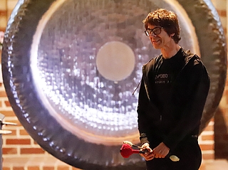 Im Zentrum des Konzerts steht ein 1,90 Meter großer Paiste-Gong, ein Instrument von gewaltiger Präsenz und seltener klanglicher Tiefe. Seine sich langsam entfaltenden Schwingungen durchdringen den Raum wie ein atmendes Klangfeld – mal als fernes Donnergrollen, mal als irisierende Lichtgestalt. Dieses außergewöhnliche Instrument zählt zu den größten seiner Art und macht jedes Konzert zu einem einzigartigen, nicht wiederholbaren Erlebnis, das weit über das rein Musikalische hinausgeht.