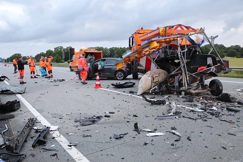 Der Unfall hatte sich gegen 3.45 Uhr zwischen den Anschlussstellen Bad Bramstedt und Großenaspe in Richtung Norden ereigen. Die Mitarbeiter der Autobahnmeisterei waren zum Unfallzeitpunkt glücklicherweise nicht in dem Lkw und blieben unverletzt. Der Autofahrer hingegen kam verletzt in eine Klinik.