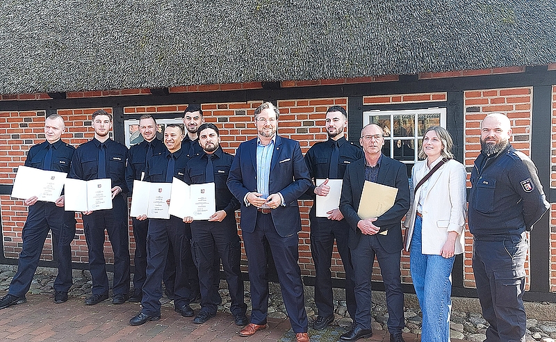 Glückstadt (jhf) Sie haben erfolgreich eine zweijährige Ausbildung durchlaufen. Sieben Beamte auf Probe werden ihre Arbeit in der Abschiebehafteinrichtung Glückstadt aufnehmen. Sie werden für die unmittelbare Versorgung, Beaufsichtigung, Betreuung und Behandlung der Geflüchteten verantwortlich sein. Ihre Ausbildung absolvierten außerdem weitere 15 Anwärterinnen und Anwärter des Allgemeinen Vollzugsdienstes