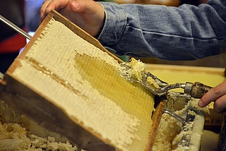 Unter Anleitung der erfahrenen Wildparkimker dürfen die Besucher mitmachen und helfen, den flüssigen, goldgelben Honig aus den Waben zu schleudern.