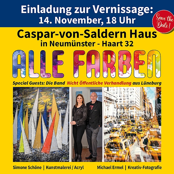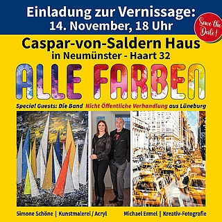Neumünster (pm) - Bereits die zweite Gemeinschaftsausstellung von Michael Ermel und Simone Schöne startet am 14. November um 18 Uhr mit einer Vernissage, diesmal im Caspar-von-Saldern-Haus. Ihre erste erfolgreiche Ausstellung hatten die beiden zusammen vor einem Jahr in der Kulturwerk Galerie in der Esplanade.