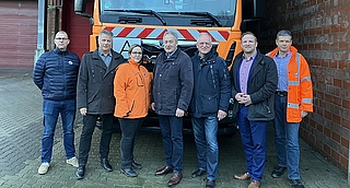Zusammen gut aufgestellt ins Jahr 2025 (v.li.) Peer Valentin, Bereichsleiter Kaufmännische Leitung, Jens David, Vorsitzender Personalrat, Ceyda Oguz, Bereichsleiterin Abfallwirtschaft und Abfallanlagen, Klaus Gerdes, Vorsitzender des Hauptausschusses, Ralf Martens, Vorsitzender der Verbandsversammlung, Toni Köppen, stv. Vorsitzender des Hauptausschusses und Jan Lawerentz, Bereichsleiter Kommunale Dienste. Foto: WZV