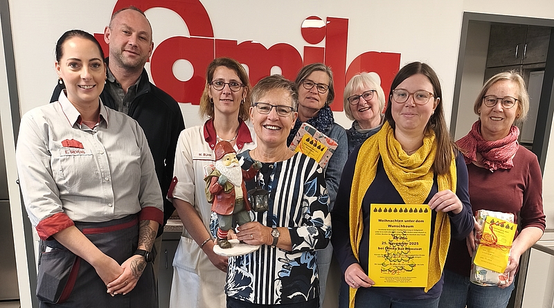 Zusammen mit ihrem Chef Fabian Seeliger unterstützen (v.li.) Elina Sievers und Melanie Buhk vom famila-Team die Projektbeauftragten Helga Supola (Kinderschutzbund), Petra Brennecke (Diakonie Altholstein), Jennifer Bestmann, Ingrid Schuldt und Anke Ratjen (alle Kinderschutzbund) auch dieses Jahr wieder bei der Aktion „Weihnachten unter dem Wunschbaum“. Foto: Straehler-Pohl